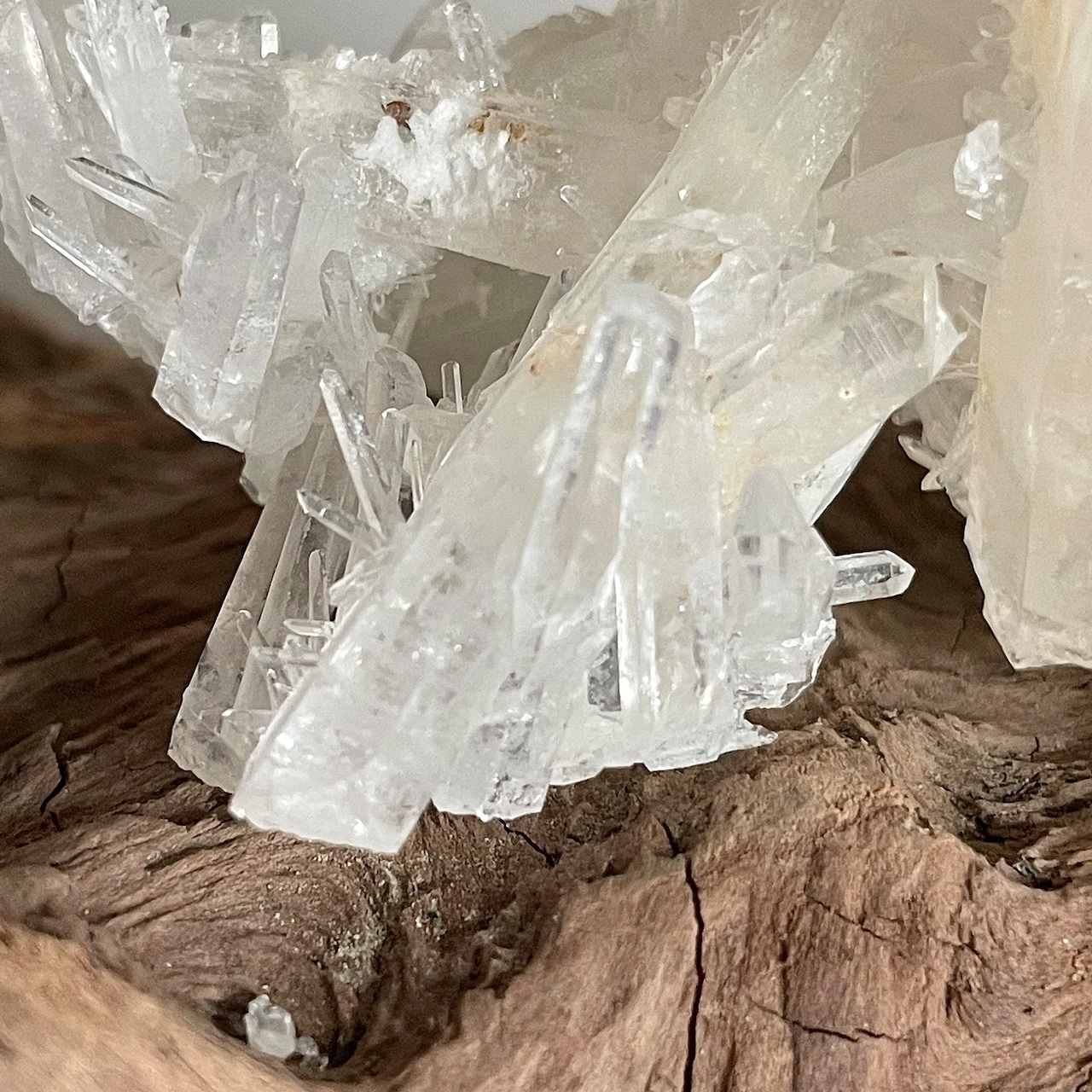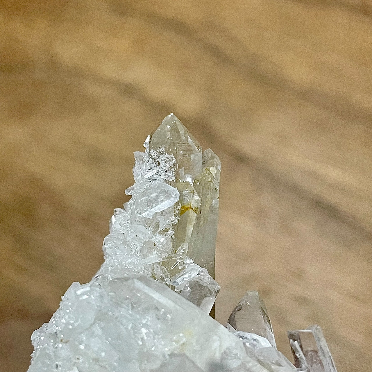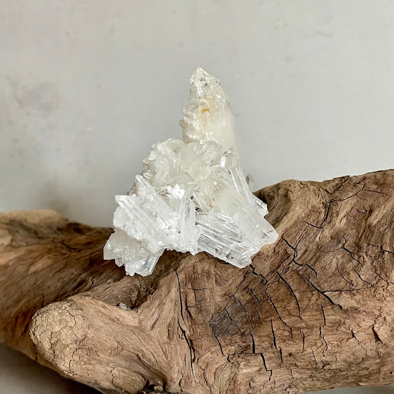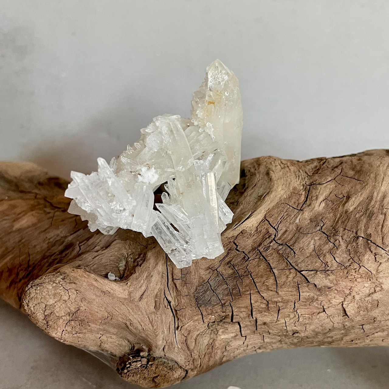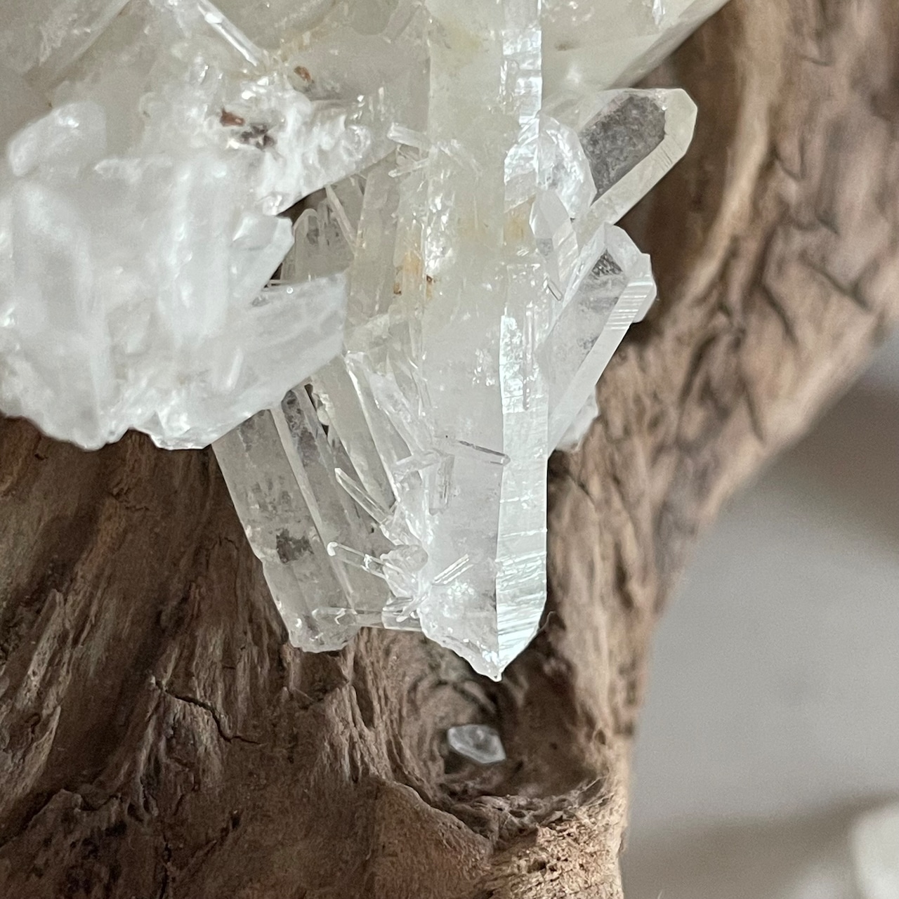 中心部に3センチほどの細長く通った水晶の周りに、細かな水晶の結晶がたくさん付いている繊細で透明感のあるクラスターです