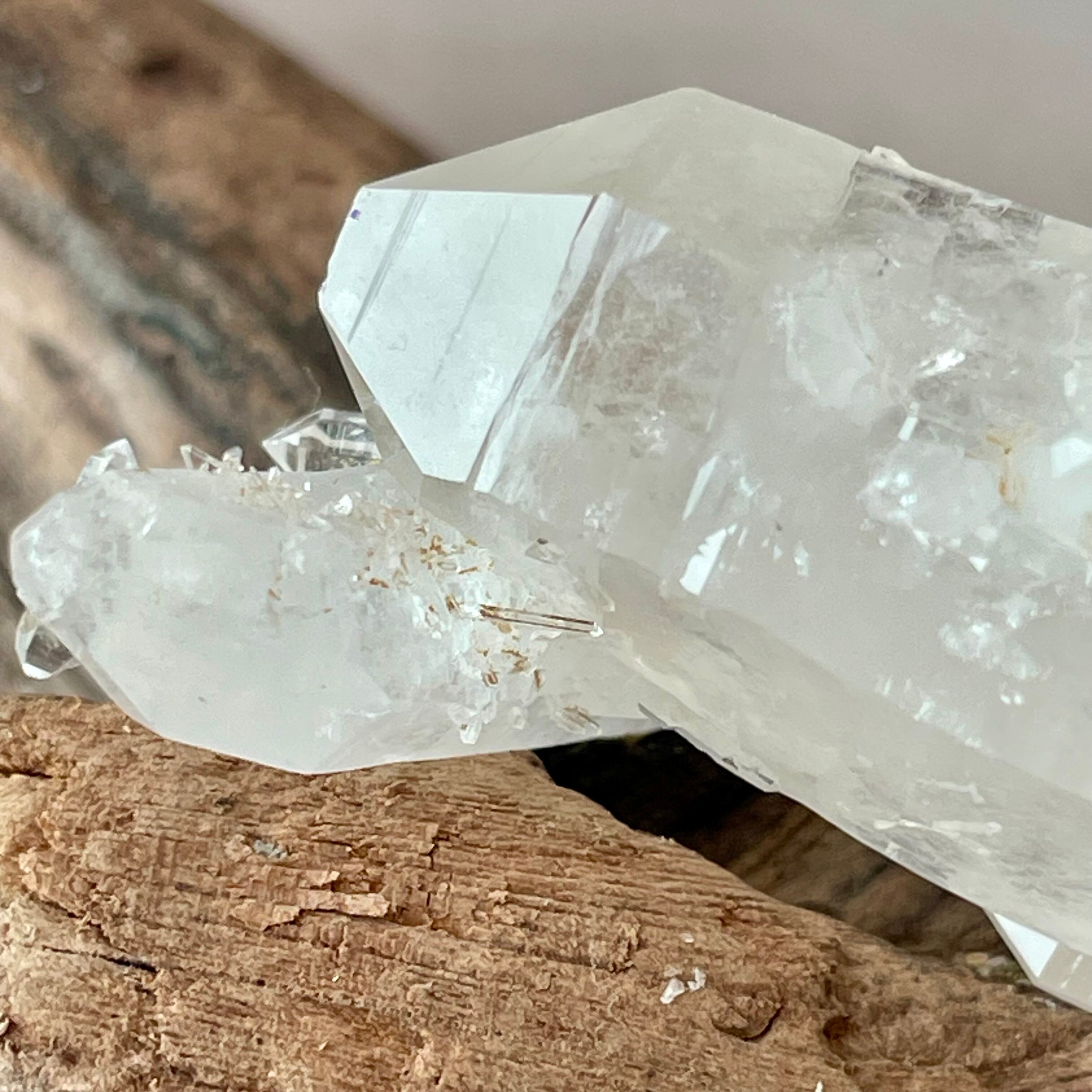 しっかりとした結晶の頭にシンプル両剣水晶を付けた面白い水晶です。