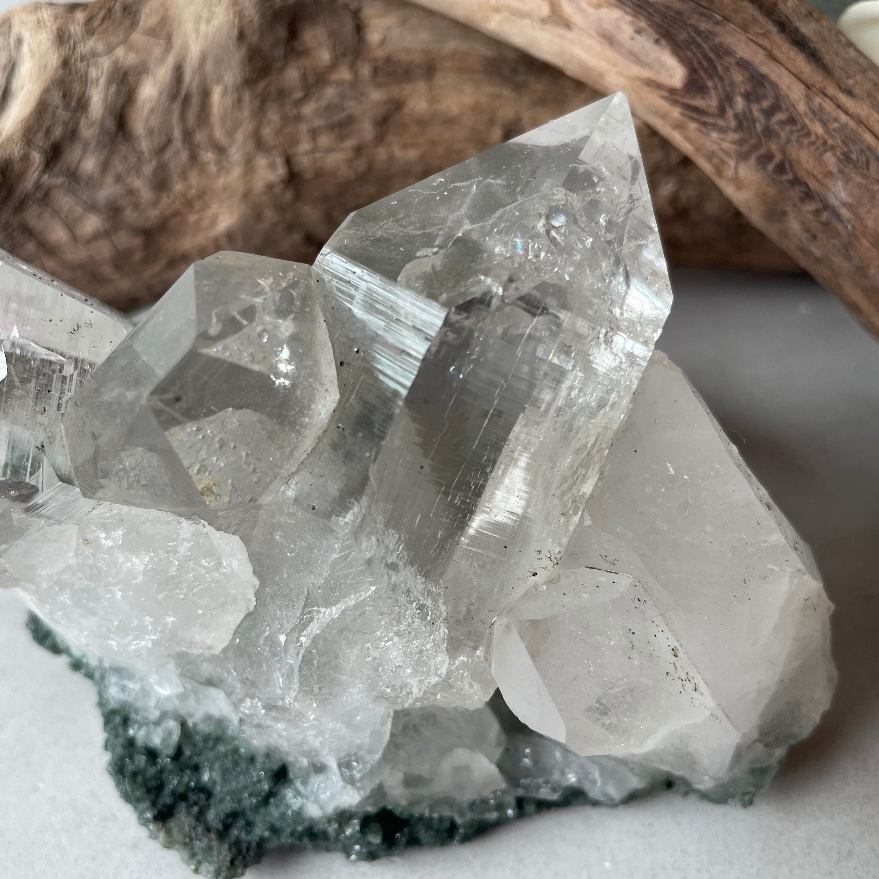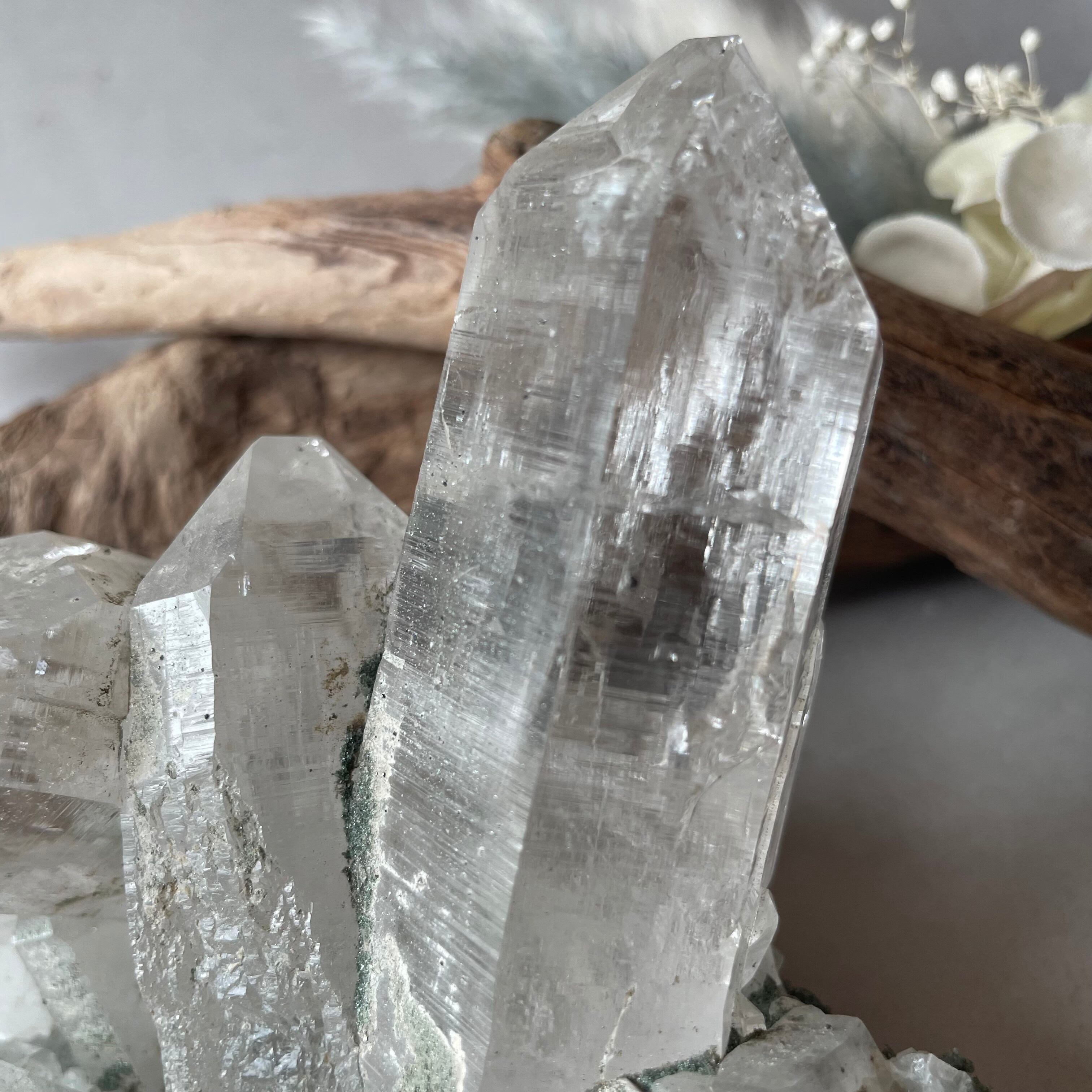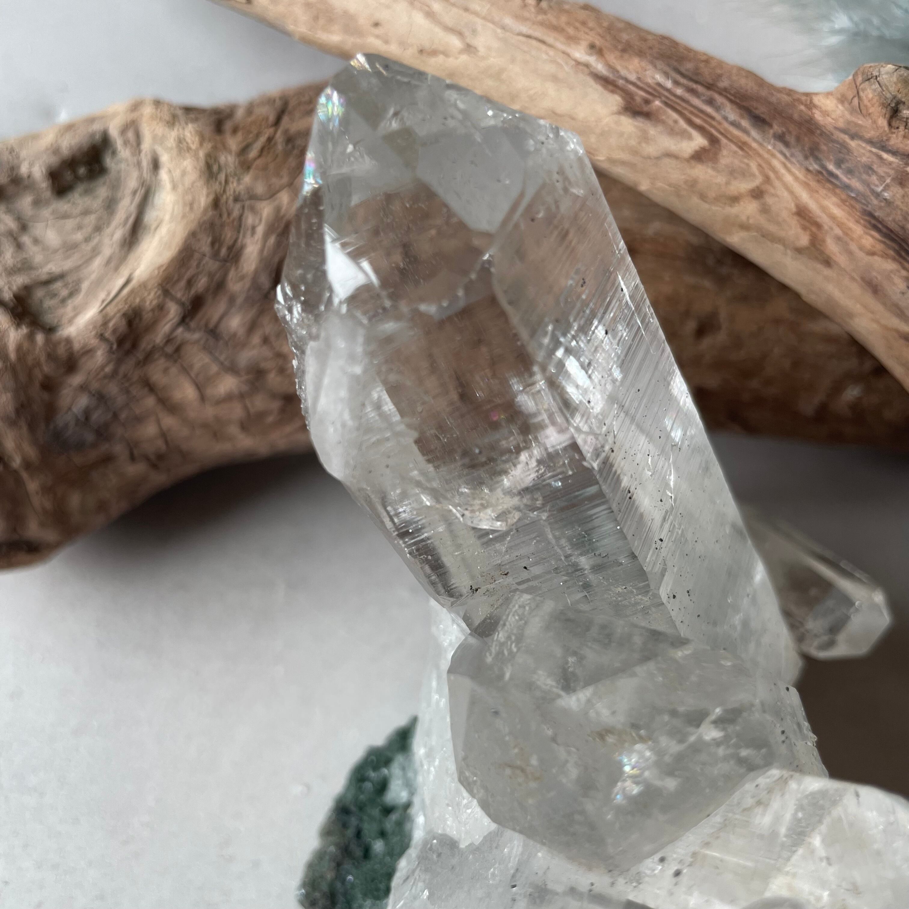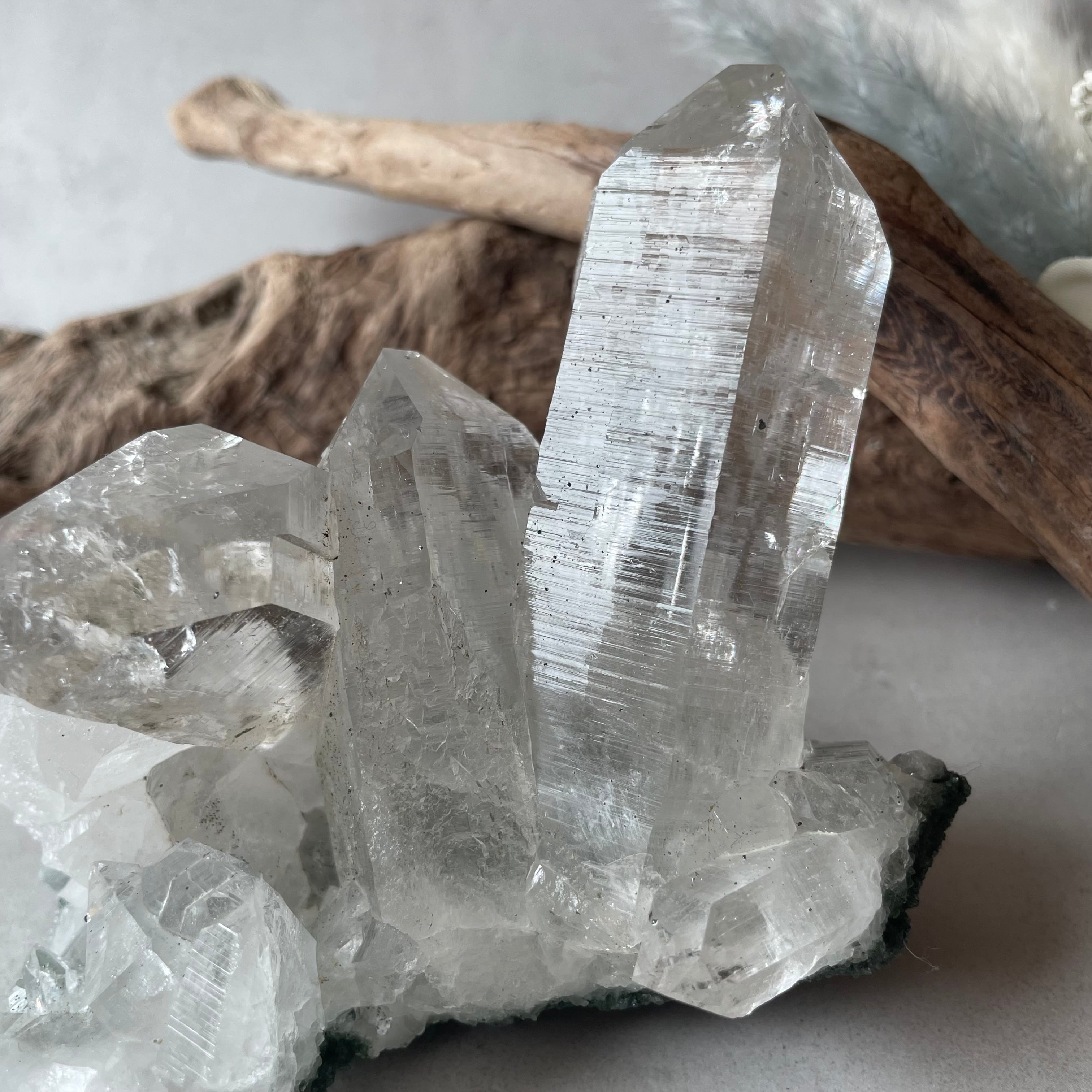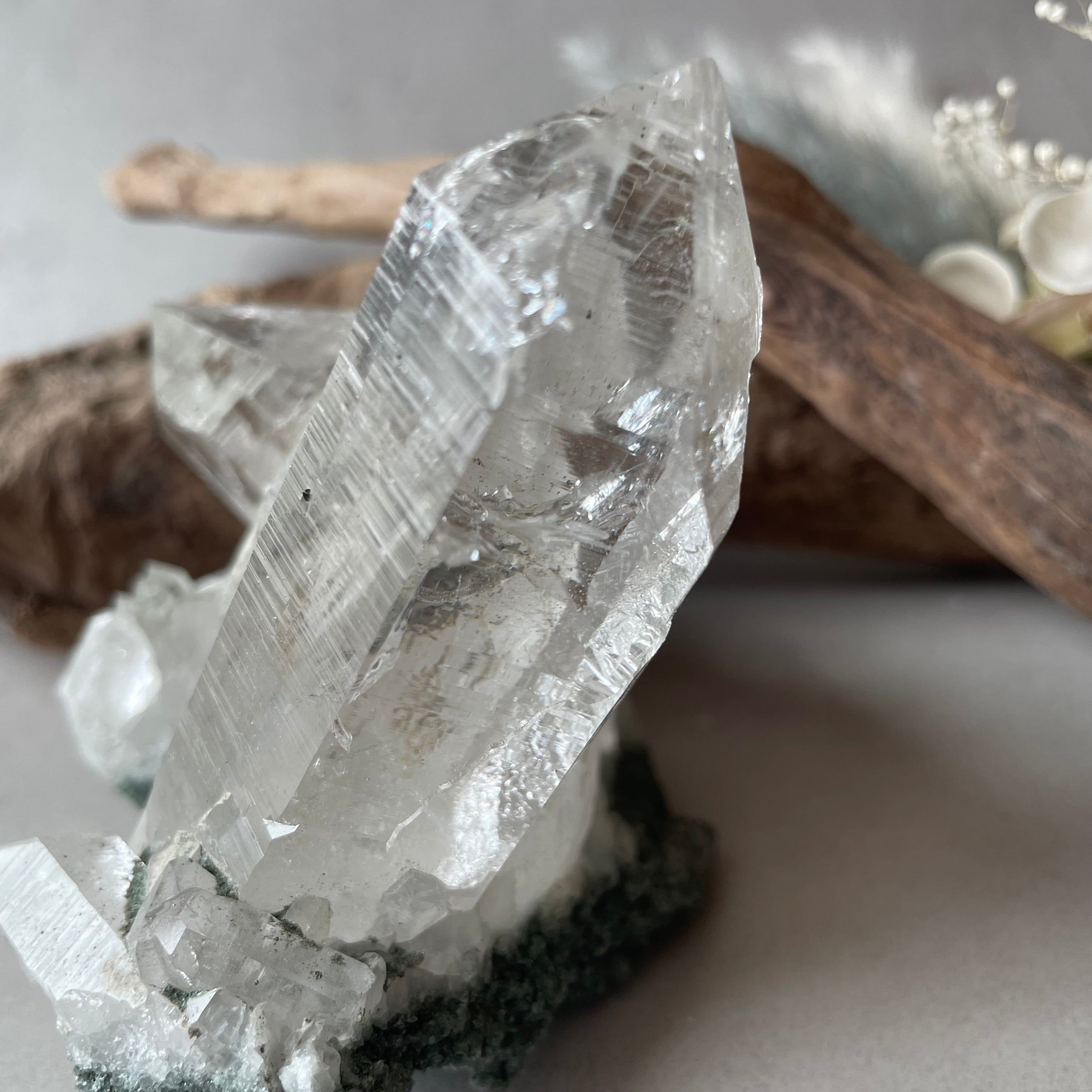 クローライトの母岩をもつ透明度の高いマニハール水晶です。