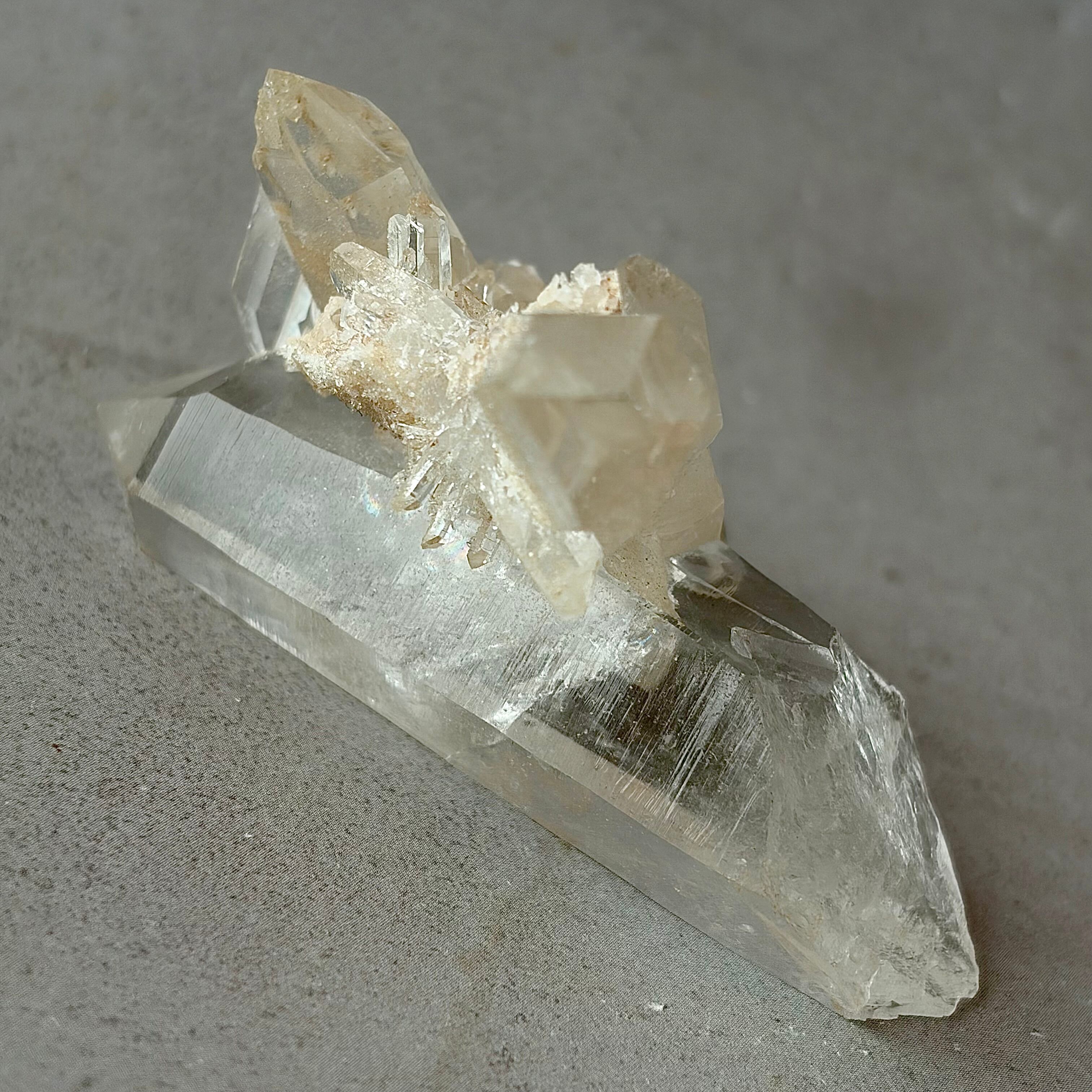 少し大きめなスタイルの良い結晶と透明度の高い細かな結晶が付随したバランスの良いクラスターです。